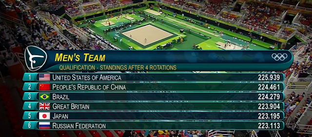 USA still leads China despite having to count two 13's on PH. I originally thought they weren't podium material but they're much stronger than the team they had at World's, and with room to grow on two events, they could very well challenge for gold in TF's if they're up to it. Russia is obviously capable of doing better than they have been, but even Brazil is surprising me now! Btw, on the pic below, NBC is wrong, these are the standings after 5 rotations.